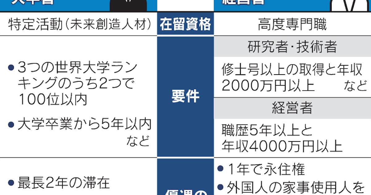政府は17日、日本で働く外国人の高度人材を増やす新たな受け入れ策を決定した。高収入の技術者や経営者が1年で永住権を得る制度を新設する。在留資格に新たな枠組みを設け、世界の上位大学の卒業者が就職活動で最長2年、日本に滞在できるようにする。4月...